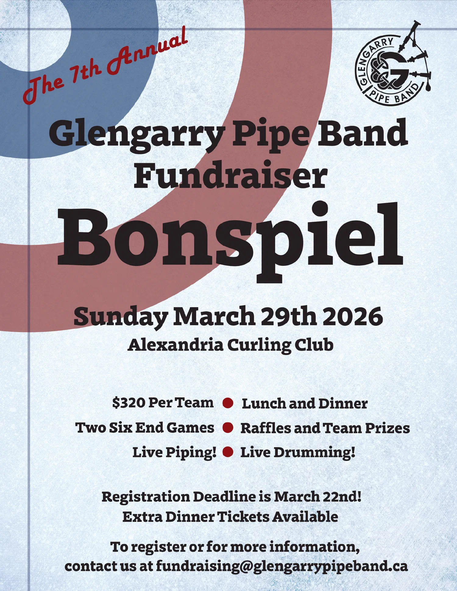 It is that time of year again! Our annual Bonspiel is happening on Sunday March 29th! Round up your friends and sign up your team for a fun day of curling in support of the Glengarry Pipe Band.